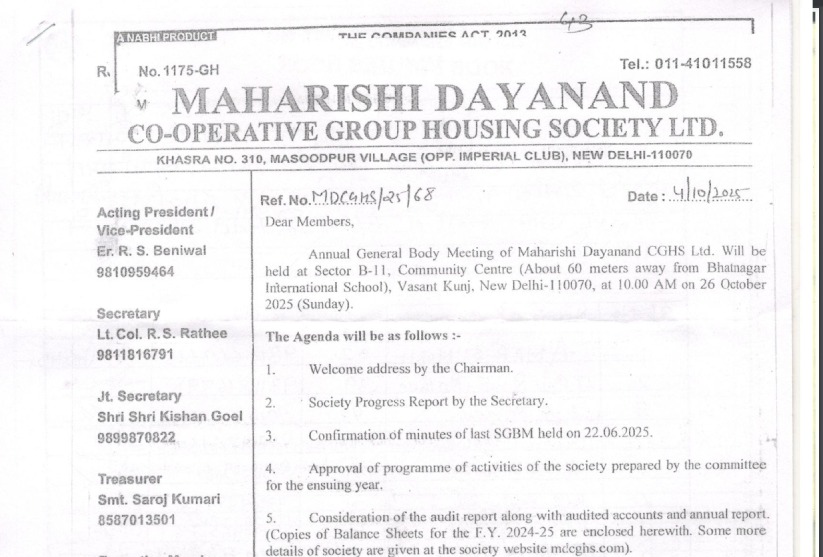 MAHARISHI DAYANAND. CO-OPERATIVE GROUP HOUSING SOCIETY LTD. B-4, VASANT KUNJ, (ADJOINING B-5/B-6 DDA FLATS), NEW DELHI-110070